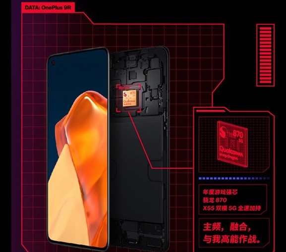 骁龙870基于台积电 7nm工艺制成,包括一颗 A77(3.19GHz)超大核+三颗 A77(2.42GHz)大核以及四颗 A55(1.8GHz)效能核心。一加9r采用6.55英寸AMOLED柔性打孔屏,支持120Hz屏幕刷新率,240Hz五指触控,以及8192级自动亮度调节,屏幕分辨率为2400×1080像素。