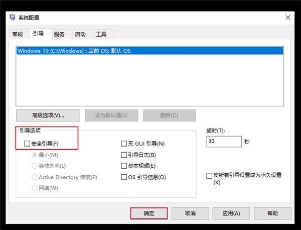 2、打开系统设置界面,切换到“引导”选项卡,勾选“安全引导”,点击“确定”。