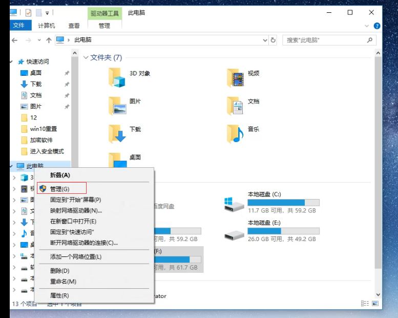 1-1:打开电脑的任何一下文件夹,在左边目录树可以看到【此电脑】的图标,右键选择【管理】项,操作如下图。