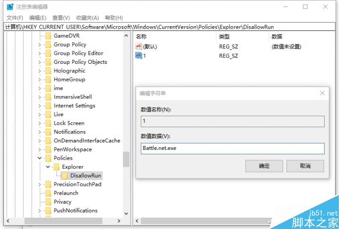 之后在“Explorer”中,再新建名为“DisallowRun”的子项,并在右侧新建个名为“1”的字符串,数值数据中输入要禁止的运行程序名称(要带.exe,如QQ.exe)。