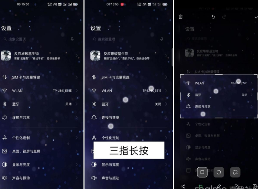 三只手指在屏幕上长按即可选择区域进行截屏。截图的形状既可以是矩形也可以是圆形,还可以是手绘区域
