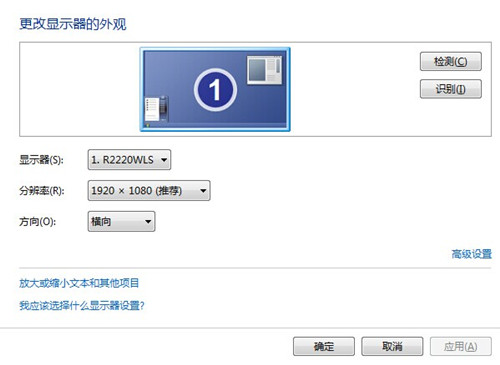 看看你的系统设定里面是否出现了1680*1050(16:10)和1920*1080这两种显示分辨率的任意一种,如果出现了就说明你的显示器没有使用错误的分辨率,这个分辨率即为最佳的显示分辨率,高于或者低于这个分辨率都会造成显示不正常的现象。