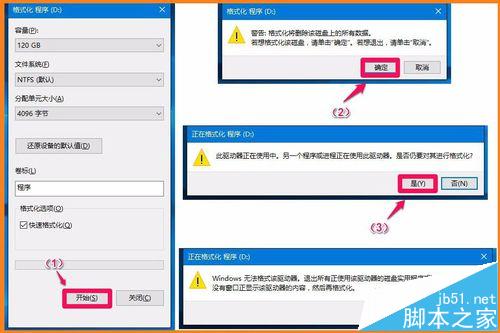 在格式化 程序(D)窗口点击【开始】,弹出警告:格式化将删除该磁盘上的所有数据(正常),点击:确定;又弹出:此驱动器正在使用中,另一个程序或进程正在使用此驱动器,是否仍要对其进行格式化?点击:是(Y);立即弹出:Windows 无法格式该驱动器。退出所有正使用该驱动器的磁盘实用程序或其他程序,并确保没有窗口正显示该驱动器的内容,然后再格式化。关闭所有正在使用的程序,再次进行D盘格式化,仍然如此(有点不正常了)。