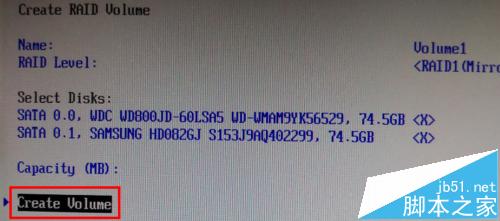 4、接上足够数量的硬盘可以显示在当前页面。选择Create RAID Volume,点回车