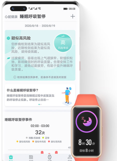 基于华为手环6高性能传感器,智能识别睡眠、HRV、血氧、心率等信息,多参数融合判断, 筛查睡眠呼吸暂停风险,提供分层分级的改善建议。