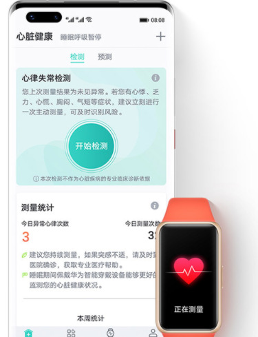 智能心律检测, 自主心脏健康管理,基于华为手环6高性能传感器,发起心脏健康研究, 精细化识别心律失常,提供房颤及早搏筛查、个性化指导、 预约就诊、跟踪随访等整合管理服务。