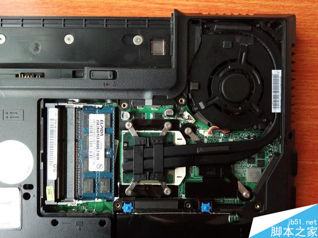 接下来,去掉内存条。然后去除散热模块,同样的,只要去除几个螺丝,就可以完成。在拆散热模块时,一定要将散热风扇的电源线拔掉,切记。