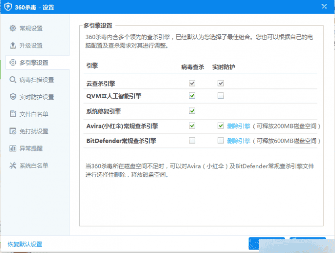 需要注意的是,选择了多引擎之后,可能会不同程度地影响到系统的运行速度。至于是否选择开启,用户可根据自己的系统软硬件配置情况,经过试验后得出选择,最终以开启更多的引擎后,操作速度能够仍受为宜。若操作速度受到影响,可选择关闭一些引擎。如果磁盘空间出现紧张的情况,还可以选择将占用200MB或600MB磁盘的大容量查杀引擎删除掉。