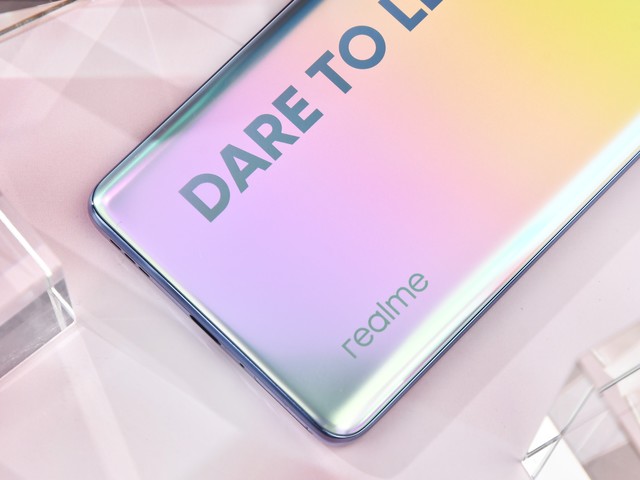 前置左上角挖孔和背部的矩阵式三摄模组设计,都是目前的主流设计方案。机身背面,左上方是竖置的三摄模组,realme的LOGO位于右下角,特别是采用纹理局部镂空设计的“DARE TO LEAP(敢越级)”字样非常显眼,设计偏向年轻潮流。另外,得益于淋涂哑光加硬液的设计,新机后壳实现均匀的磨砂手感。