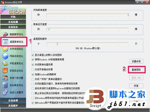 打开系统优化后,从其下找到并选择“桌面菜单优化”,然后到右侧窗口,找到“重建图标”按钮。点击。