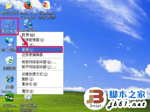 先在桌面“我的电脑”上右键,选择“管理”,如果为Win7,则桌面上为“计算机”。