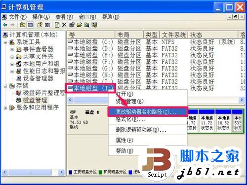 选择图标异常的本地磁盘,如“J盘”,在此项上右键,选择菜单中“更改驱动器名或路径”。