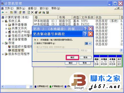 这时会弹出一个确认窗口,因为之前J是盘,没有程序运行,所以更改盘符不会有影响,如果是C盘,或者是有程序运行的磁盘,就要小心点,先保存好文件资料,再关闭程序,才可以按确认窗口的“确定”按钮。