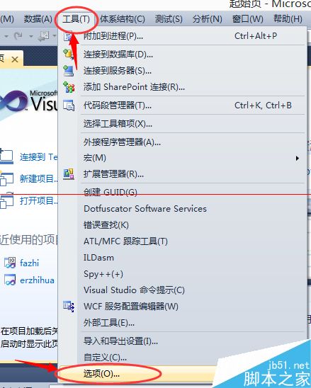 3、想要删除这些文件该怎么办呢?首先,打开Visual Studio 2010,选择“工具”—>“选项”