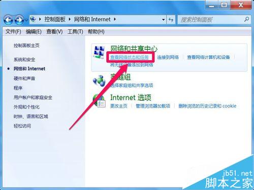 进入网络和Internet窗口后,在网络和共享中心下,点击“查看网络状态和任务”这一项。