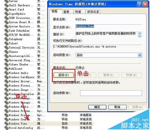 3、然后找到windows time服务项目,双击,再单击“启动”按钮。