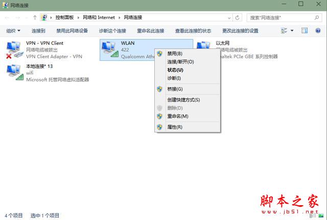 5、第五步,右键选中已连接的网络(PS:小编连的无线网422,所以选择“WLAN”,如果你是插的网线,则需选择“以太网”),点击“属性”。