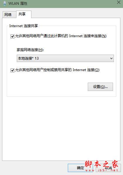 6、第六步,点击“共享"”,勾选“允许其他网络用户通过此计算机的Internet连接来连接”,并在“请选择一个专用网络连接”中,选择刚刚创建的网络“本地网络*13”(名称wifi),点击“确定”。