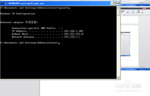 第四步,在cmd对话框内自己在键盘上敲击”ipconfig“,这里是不能复制粘贴的哦,作者君已经试验N多次了,每次粘贴都不行。考验大家英语水平的时候到了。之后按”确定“也就是”enter"键,会弹出如图二所示你的IP地址,是不是很高大上呢。。。如果没有弹出,那就是还没有设置或是网络不通哦。