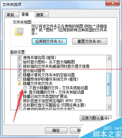 6、进入到“查看”以后,找到“不显示隐藏的文件、文件夹或驱动器”,找到后勾选。