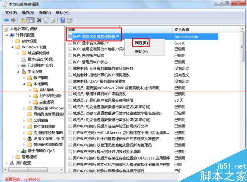 5、在左边的菜单列表中找到“账户:重命名系统管理员账户”,然后在上面点右键,之后在弹出菜单中选择属性