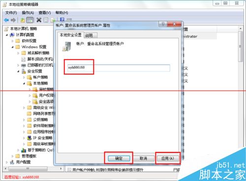 7、将输入框里面的Administrator修改为自己要改的用户名,然后点右下角的应用和确定按钮,就可以将系统默认的Administrator改为自己的用户名了