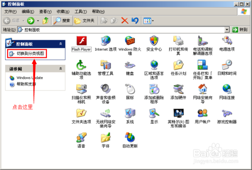 5、(不过,还有一点颜色不正常,好像是多少年前的版本。)按照第一步方法打开“控制面板”,此时,点击左侧栏上方的“切换到分类视图”按钮。