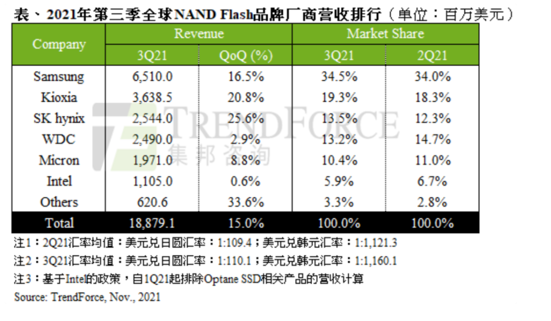 2021年第三季度全球NAND Flash品牌厂商营收排行,图源集邦咨询