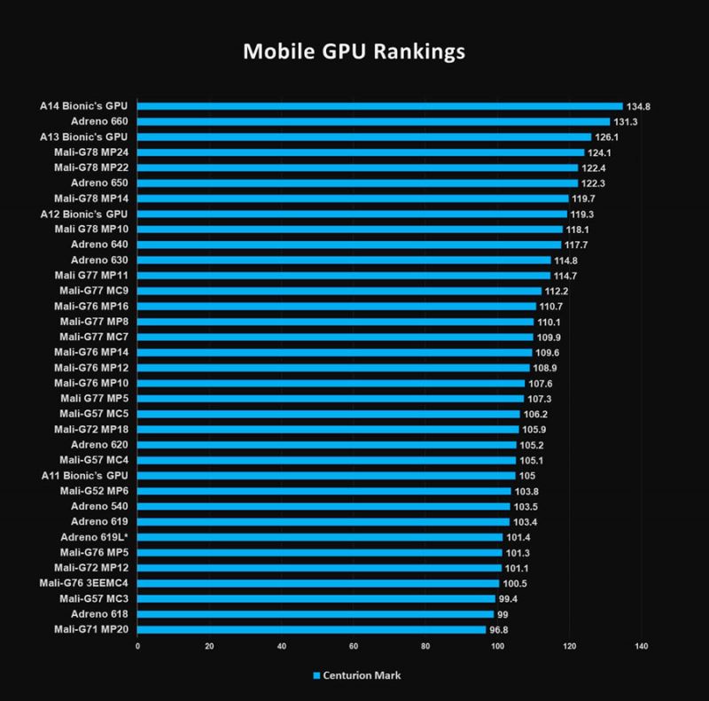 为了评估手机GPU的性能,我们使用原始基准测试以及设备的真实游戏性能得到了每个GPU的分数,并使用该分数对手机GPU的性能进行了排行并得到了天梯图。具体排名请看下面。