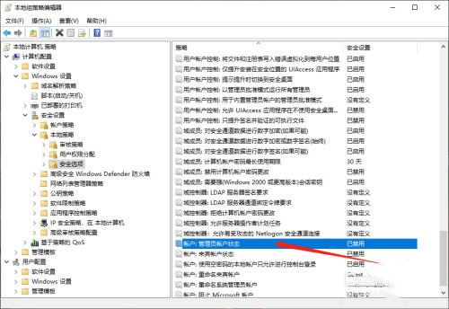 2、打开本地组策略编辑器后,以依次选择windows设置,安全设置,本地策略,安全选项,并在右侧窗口找到“账户:管理员账户状态”;