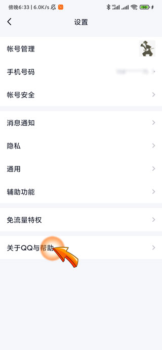 3、进入设置页面后点击“关于QQ与帮助”选项。