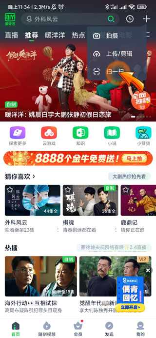 爱奇艺会员不能扫码登录另一个手机,只能登陆电脑或者平板爱奇艺,首先打开爱奇艺APP,点击页面右上角的“加号”图标,此时会弹出小窗口,点击“扫一扫”选项,最后对准二维码图标即可。