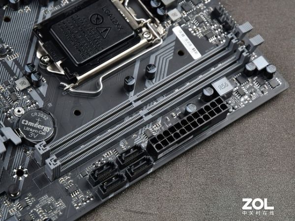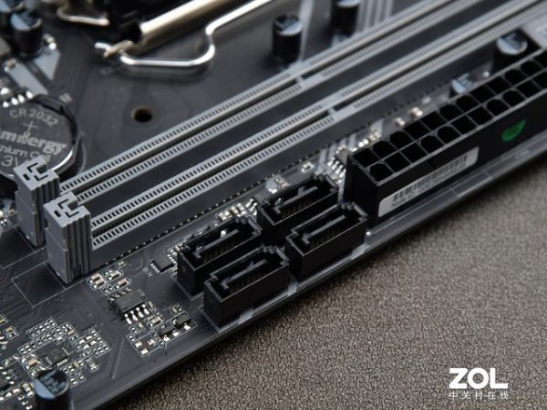 显卡插槽周围是两个M.2插槽,下面那根M.2插槽同时支持NVMe和SATA协议,可以智能切换,上面那根支持PCIe 4.0,直连CPU。