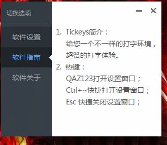 4、可以在软件指南界面获取Tickeys的信息以及查看使用方法。