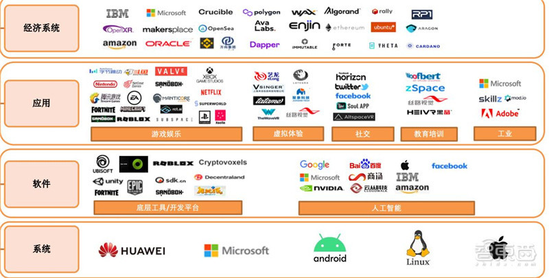 将元宇宙的“科技-应用”发展正循环分为6层架构:底层硬科技(核心)、硬件计算平台、系统、软件、应用、以及让整个元宇宙生态运作起来的经济系统。