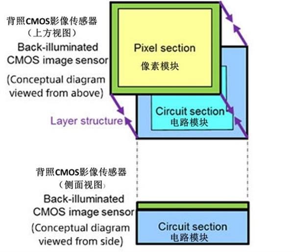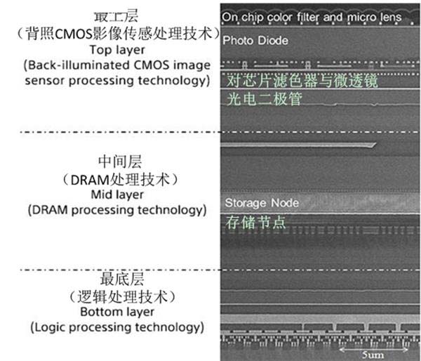 从上面的对比图我能明显的看出,DRAM层位于像素模块和电路模块之间。当像素模块获得了影像信息,将率先传递给DRAM进行短时间存储,接着再通过电路模块对影像信息进行处理,而DRAM层起到了一个缓冲的作用。