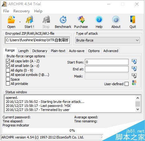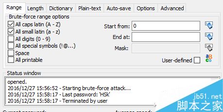 “Range”的设置项目就很好理解了,主要是让我们划定破解密码范围,建议大家先只先勾选数字0-9,如果无法解出密码,再逐一勾选小写字母、大写字母和各种符号,让软件尝试多种密码组合,勾选的内容越多,需要花费的时间也就越多。而在“Length”项目中,我们需要对软件尝试进行解密的密码长度进行设定,简单来说,如果是6位数字密码的话,那组合也就999999种,软件几秒之内就能用穷举法计算出来,要是6位字符密码的话,那就有261698383种,也花费不了多少时间(时间和你的处理器运算能力成反比),但如果加上字符等其他符号的话,结果就非常可怕了。