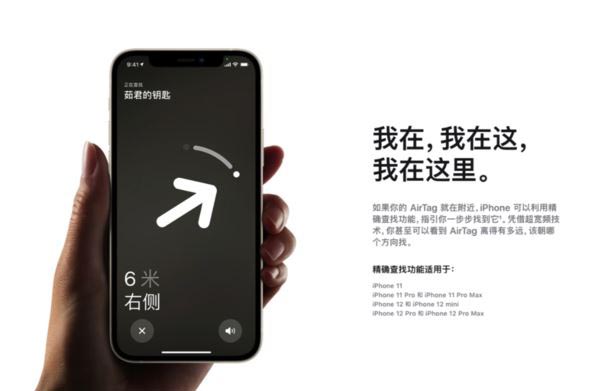 AirTag 都采用超宽带技术的U1芯片,从而为 iPhone 11 和 iPhone 12 用户提供 Precision Finding 功能。这功能的技术可以更准确地确定丢失的 AirTag 在一定范围内的距离和方向。Precision Finding 融合来自摄像头, ARKit ,加速计和陀螺仪接收到的数据,通过让 AirTag 发出声音、震动、发光的方式引导用户找到 AirTag。