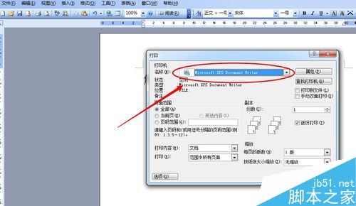 点击文件菜单--打印,弹出打印对话框。查看箭头所指的位置是否为Microsoft XPS Document Writer