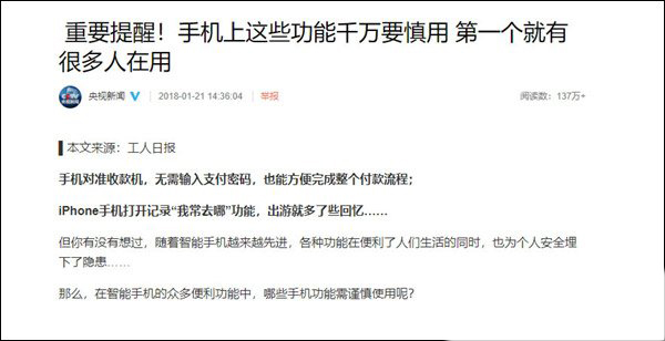 1月22日消息 近日,网络中突然出现了一篇题为《手机上这些功能千万要慎用 第一个就有很多人在用》的文章。值得一提的是,除了部分自媒体和撰稿人外,就连央视新闻等官媒也进行了转发!那么,手机中需要慎用的功能有哪些呢?让我们一起去了解一下。