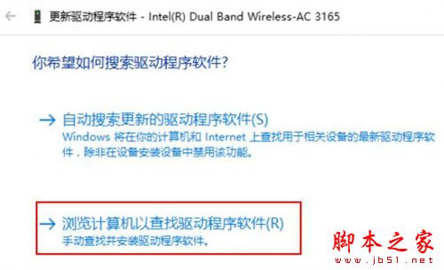 在Windows 10系统中,鼠标右键点击“此电脑”依次进入“属性→设备管理器→网络适配器”,右键点击带有AC3165后缀的无线网卡并选择“更新驱动程序软件”(图2),在弹出来的界面中选择“浏览计算机以查找驱动程序软件”(图3)。
