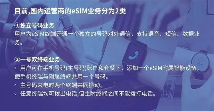 目前eSIM业务共有两种方案,分别是一号双终端和独立号码,目前联通在全国开通的是一号双终端。一号双终端和独立号码区别在于:一号双终端指的是手表手机共用一个号码,共享一个套餐,手表不支持短信业务。相反,独立号码指的是给手表独立开通一个号码,手表可以独立接打电话,收发短信,使用数据流量。从实用性来说,独立号码与我们想象中的eSIM更接近。