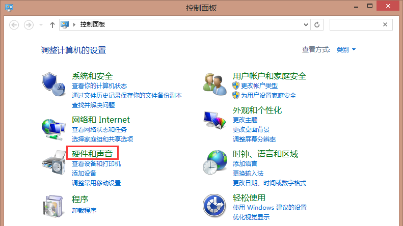 1、在控制面板中,有不同的查看方式,分不同类别的自然叫【类别】查看方式,点击鼠标所属【硬件和声音】