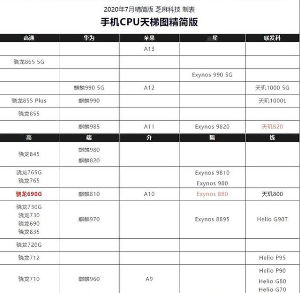 而依然在天梯图中坚守第二的骁龙865,是目前安卓阵营中最强的芯片,同时也是性能最强的5G芯片,最高主频可达2.84GHz,安兔兔跑分普遍超过60万。骁龙865的性能表现虽不及苹果A13,但在业内也同样属于佼佼者。