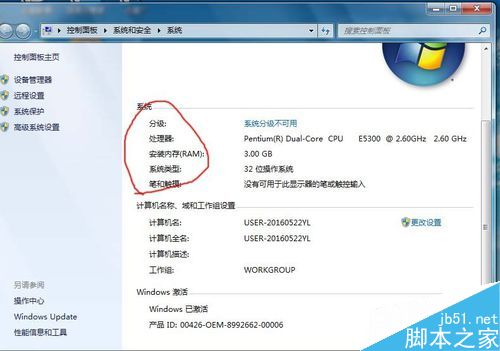 2、选择属性后,我们会看到这样一个界面,红色圈中部分就是一些计算机的硬件设备信息。