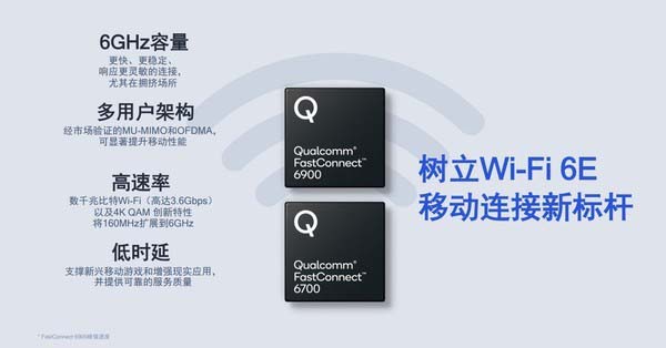 除了四款全新的网络平台产品组合,高通这一次还带来了两款面向移动端的Wi-Fi 6E解决方案——基于领先的Wi-Fi 6和蓝牙音频技术特性而打造,Qualcomm FastConnect 6900和Qualcomm FastConnect 6700移动连接系统。高通介绍,这两款新品是目前业界速度最快的移动Wi-Fi解决方案。